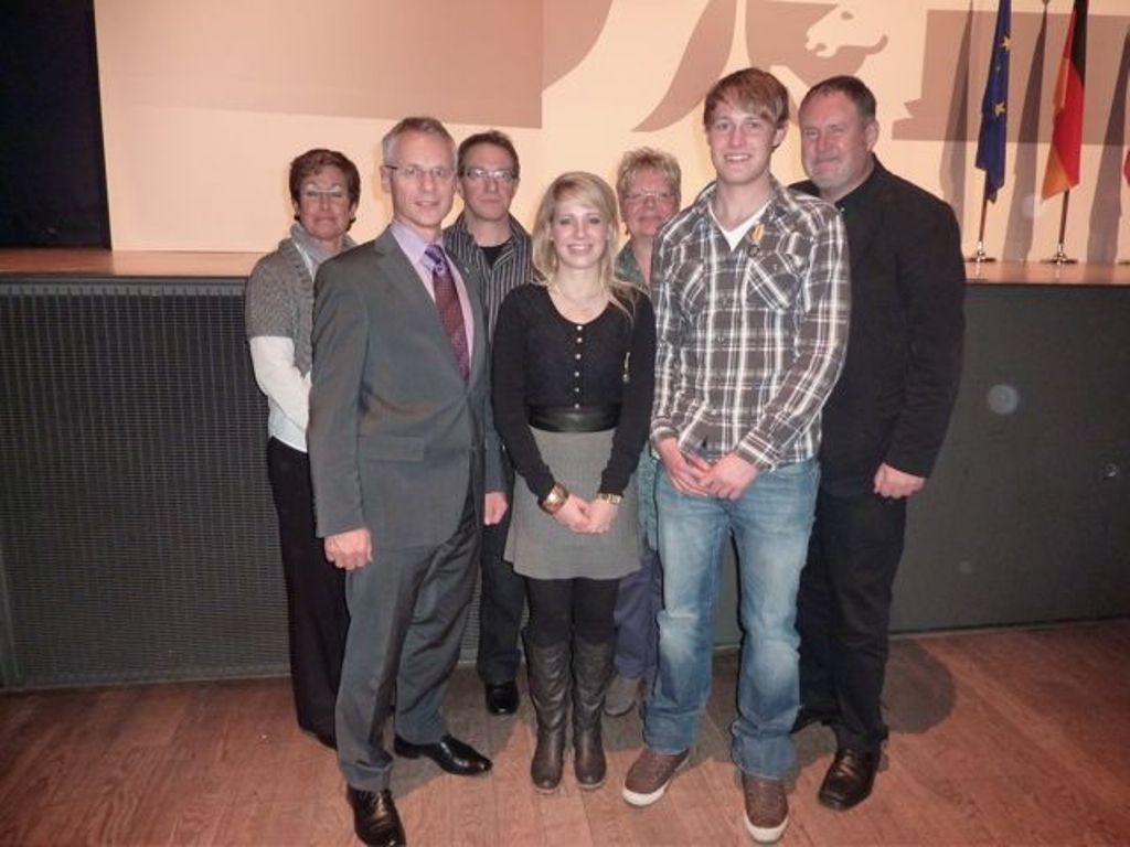 Karl-Heinz Hermanns gratuliert in einer Feierstunde in Essen Julia Kleine aus Kesternich sowie Marc Nießen aus Huppenbroich zur Verleihung der Rettungsmedaille des Landes Nordrhein-Westfalen. Die Verleihung der Rettungsmedaille durch die stellvertretende NRW-Ministerpräsidentin Sylvia Löhrmann erfolgte aufgrund einer Rettungsaktion, bei der die beiden Geehrten eine verletzte Person aus einem brennenden PKW retteten.